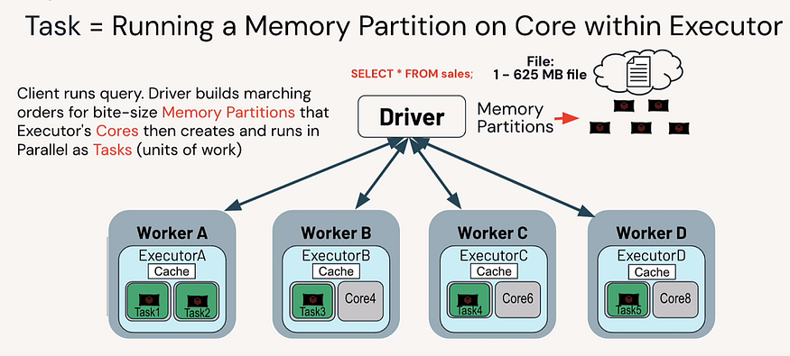 If the client submits the query SELECT * from SALES to a spark cluster and let’s assume the file size is 625 MB. Spark driver divides the file into 5 partitions and sends those to executors of each worker node to run the tasks in parallel as below automatically.
