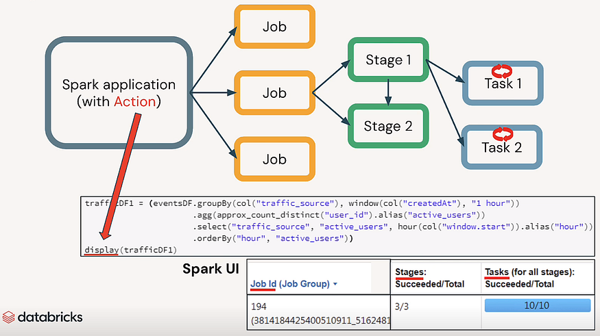 In the following example, spark achieves the parallelism by an action that divides the application into jobs, each job is divided into stages and each stage is divided into Tasks.