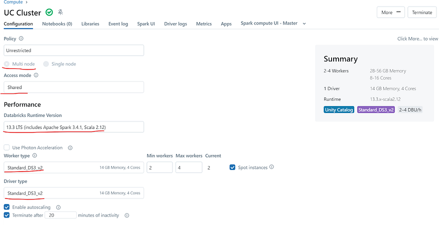 Auto Termination: In the above screenshot, the 20 minutes interval of auto termination will terminate the cluster automatically after 20 minutes of inactivity.